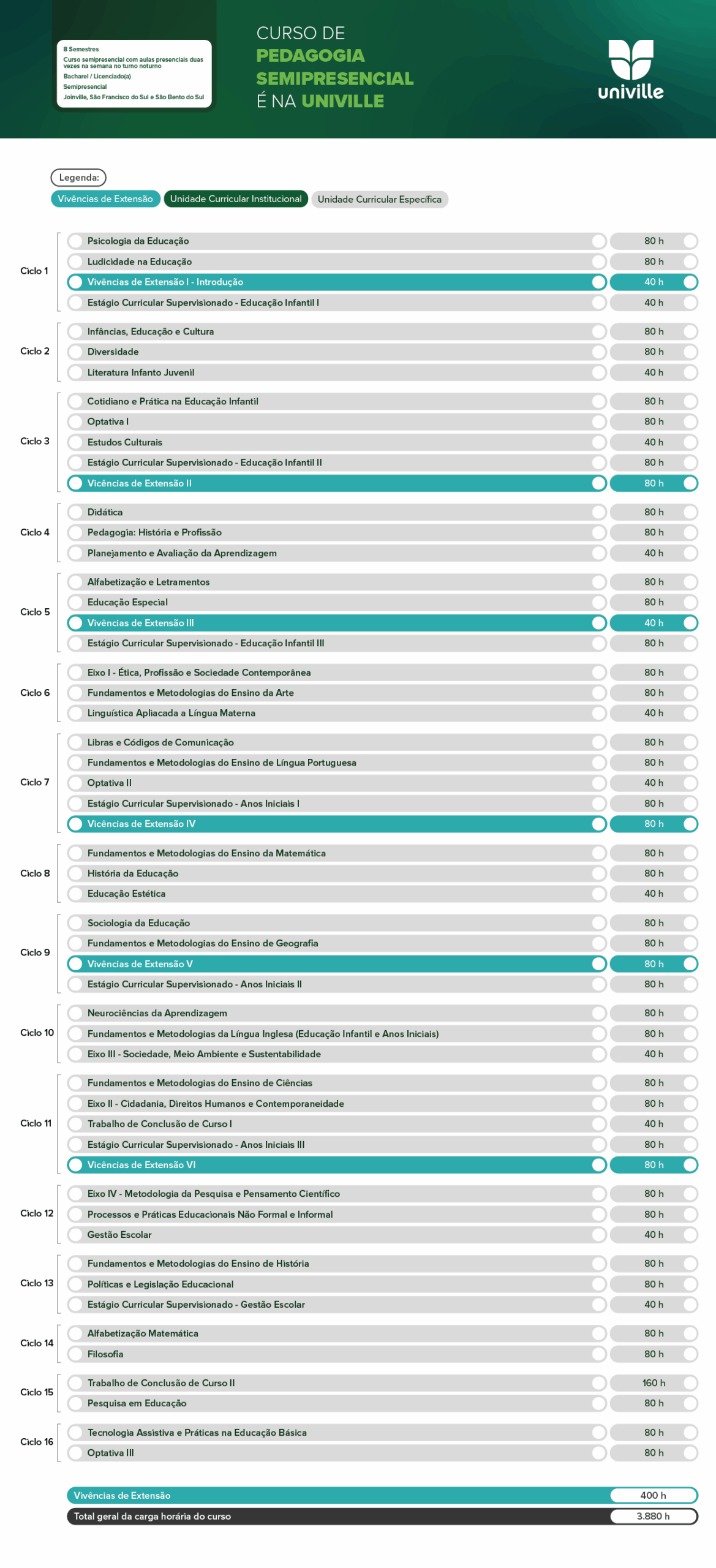 “O curso de licenciatura EAD em Pedagogia da Univille é para as pessoas que sonham em contribuir com a educação. A matriz curricular foi pensada para garantir uma atuação na educação básica, e o corpo docente é estimulado a trabalhar o conteúdo de maneira inclusiva, interdisciplinar e multicultural.
